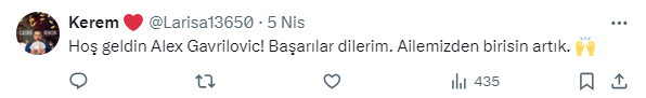 Kerem adlı twitter kullanıcısı “Hoş geldin Alex Gavrilovic! Başarılar dilerim. Ailemizden birisin artık.” ifadelerini kullanarak başarı dileri.