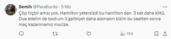Semih adlı twitter kullanıcısı “Çöp hiçbir artısı yok. Hamilton yetersizdi bu hamilton dan 3 kat daha kötü. Dua edelim de bodrum 3 galibiyet daha alamasın bizim bu saatten sonra maç kazanmamız mucize.” ifadesine yer verdi.